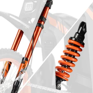 A hydraulic front fork and rear spring shock absorber soak up the big hits, keeping your tires glued to the dirt.