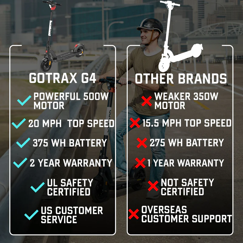 The G4 is what defines GOTRAX. As one of our best selling electric scooters for adults, the G4 has a number of features that make it a fast, convenient, and fun way to get around town. From its lightweight folding frame to its powerful 500 watt motor, you’re sure to love every part of the G4.