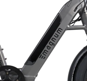 The heart of the Magnum Pathfinder T is the integrated, long-range 48V / 17.5Ah / 840Wh battery that powers rides up to 55 miles long, depending on variables like body and cargo weight, terrain, wind direction, and pedal assist level.